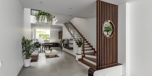 Cầu thang có độ dốc cao sẽ gây nguy hiểm khi di chuyển và không tốt về mặt phong thủy. Vậy nên, bạn có thể cân nhắc cho cầu thang chạy dọc theo bức tường phòng khách. Tuy nhiên, cầu thang hướng thẳng ra cửa chính sẽ làm hao tán tài lộc của gia đình. Bạn có thể làm vách ngăn giữa cầu thang và cửa chính để hóa giải kiêng kị này.