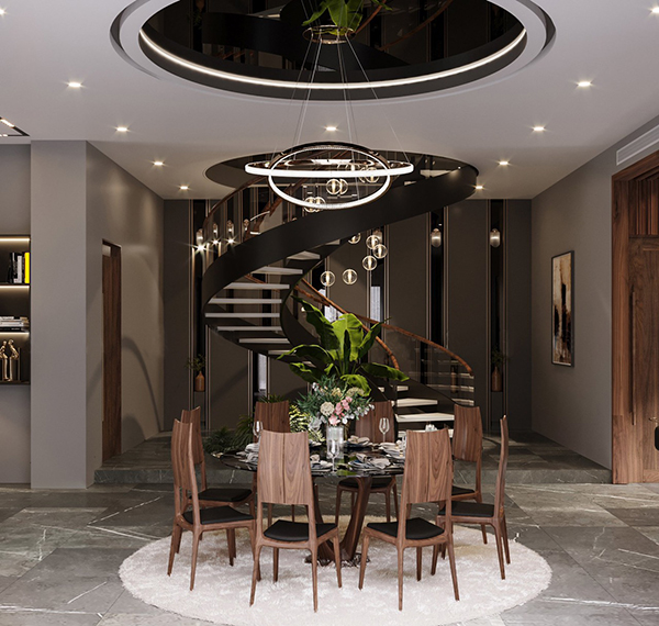 Phòng khách có cầu thang xoắn ốc tạo nên sự uyển chuyển nhẹ nhàng cho căn nhà.
