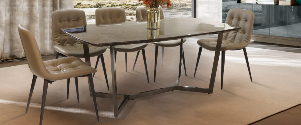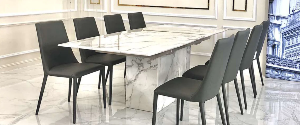 Được làm từ cẩm thạch tự nhiên nguyên khối, bàn ăn CATANIA sở hữu vân đá độc đáo cùng lớp sơn mài bóng gương sang trọng, chân bàn thiết kế thon dài đơn giản hòa hợp mọi không gian phòng. Kết hợp vừa vặn từ 4 – 6 ghế ăn.