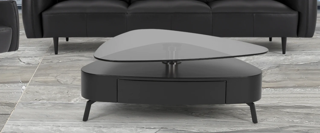 Bàn cafe nhập khẩu Hongkong ISSAC mặt kính cường lực 10 li hình tam giác màu xám khói, xoay 360 độ, hộp thân bằng gỗ, chân bằng thép không rỉ.
