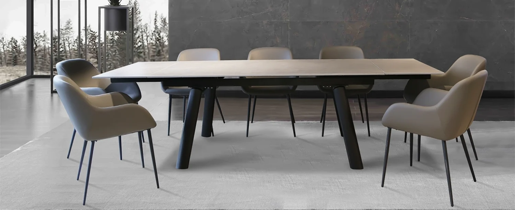 Không gian phòng ăn sang trọng với trọn bộ bàn ăn VIENNA mở rộng có thể kết hợp từ 8 – 12 ghế, chất liệu kính phủ lớp Ceramic 12 li cao cấp, chịu nhiệt đến 1200 độ C, chống thấm ẩm, chống trầy xước, h khung chân sắt sơn tĩnh điện chống rỉ sét.