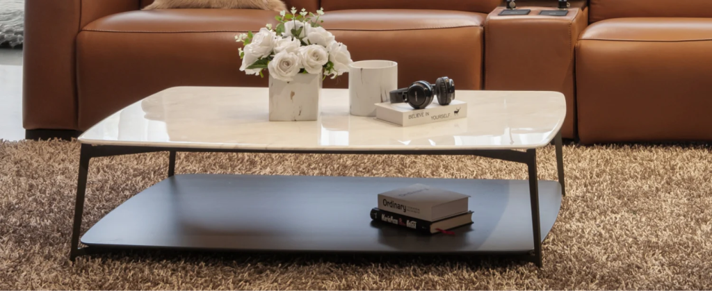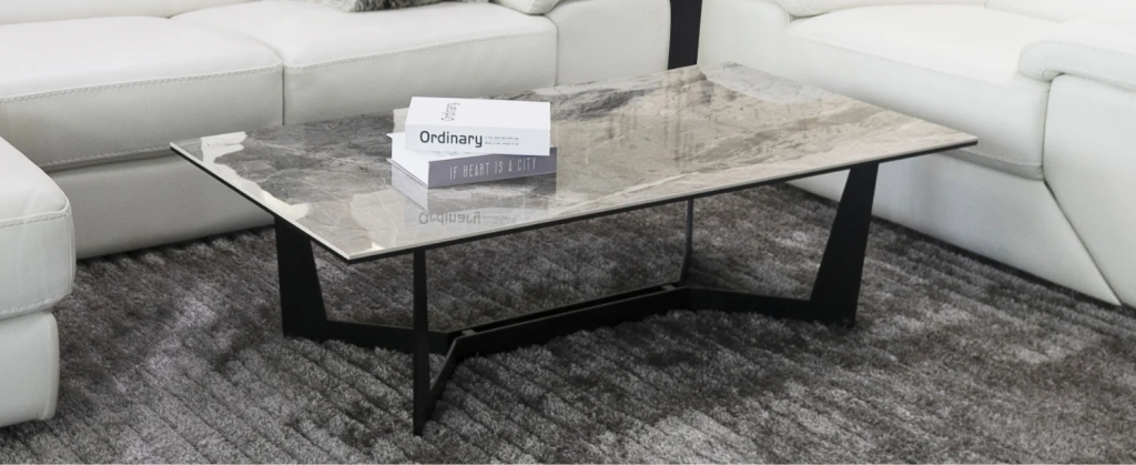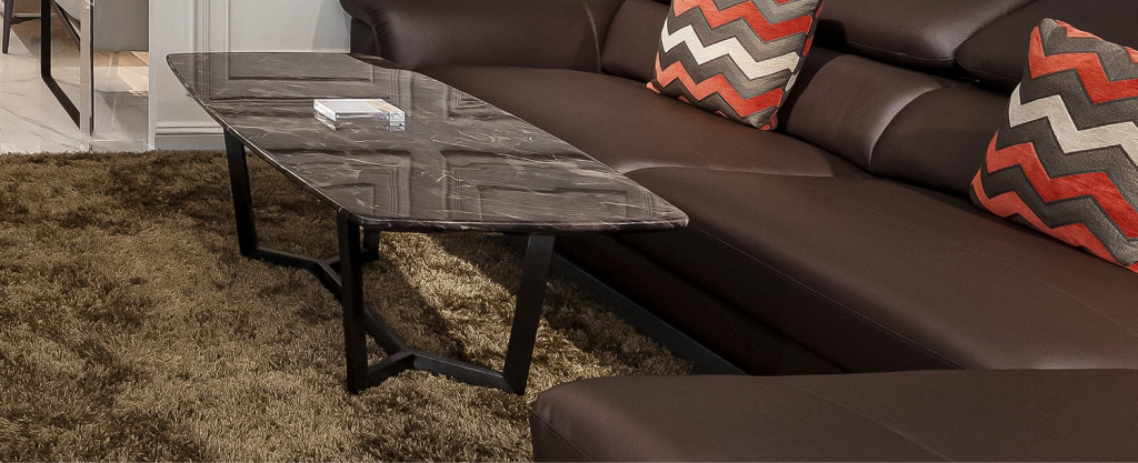 Đồng bộ với sofa thì bàn cafe MESSINA cũng sở hữu gam màu trầm và thiết kế tối giản với mặt đá cẩm thạch cao cấp, khung chân nhỏ gọn và bền chắc bằng thép không gỉ màu đen thanh lịch.