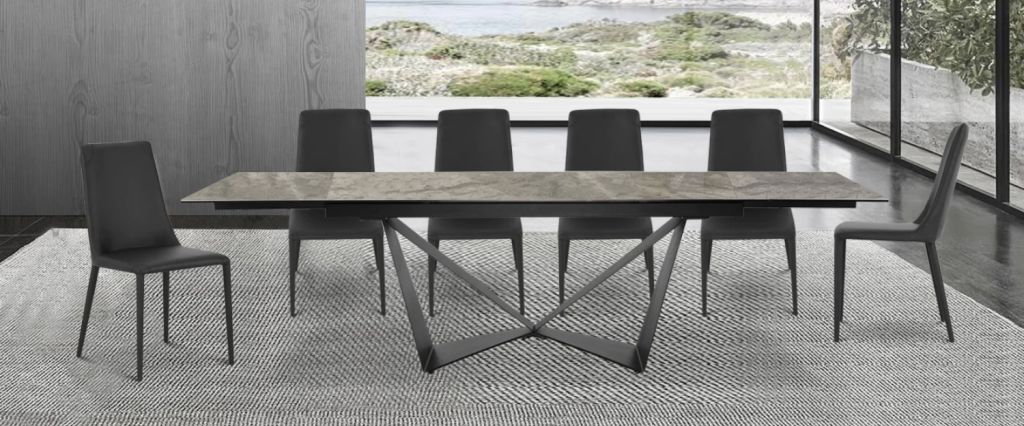 Bàn ăn NEWPORT thiết kế thuôn dài thanh lịch, có thể mở rộng hai đầu dễ dàng thay đổi kích thước 3 phù hợp từ 8 – 12 ghế. Mặt bàn 10 li bằng kính phủ ceramic Ý 5li, chống thấm ẩm, chống trầy xước, bề mặt bóng gấp 3 lần ceramic thông thường.
