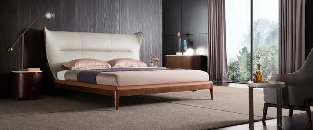 Giường SARATOGA gọn gàng với tựa đầu giường cao vừa phải, bọc da Top Grain từ Ý, khung gỗ kết hợp sắt sơn tĩnh điện vững chắc.