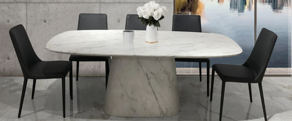 Bàn đá marble nguyên khối HILTON có dáng thon dài, bo góc mềm mại sẽ tô điểm không gian phòng ăn thêm đẳng cấp. Bàn ăn kết hợp 4 – 8 ghế ngồi vẫn mang đến sự thoải mái cho người ngồi.