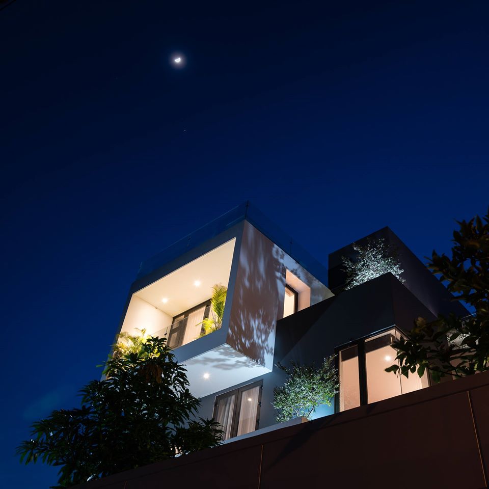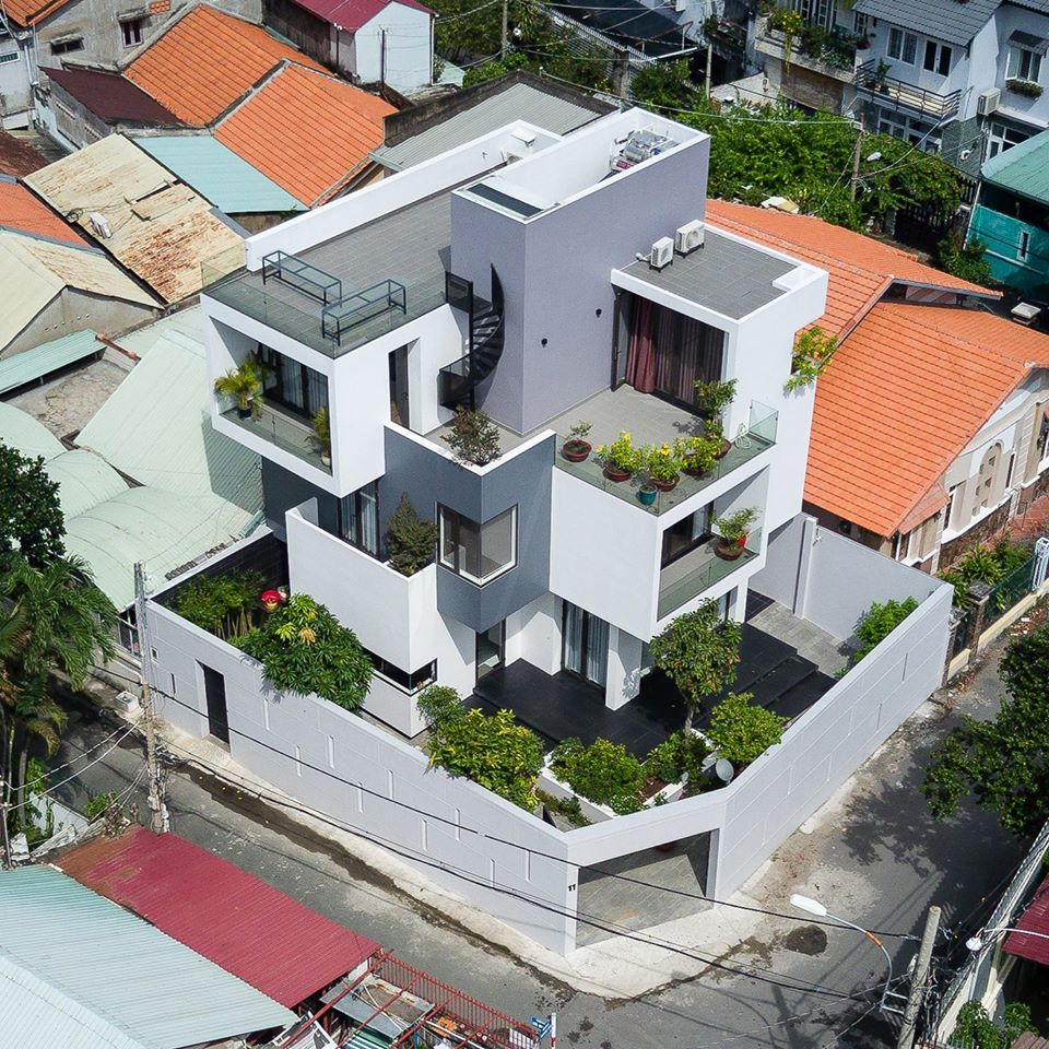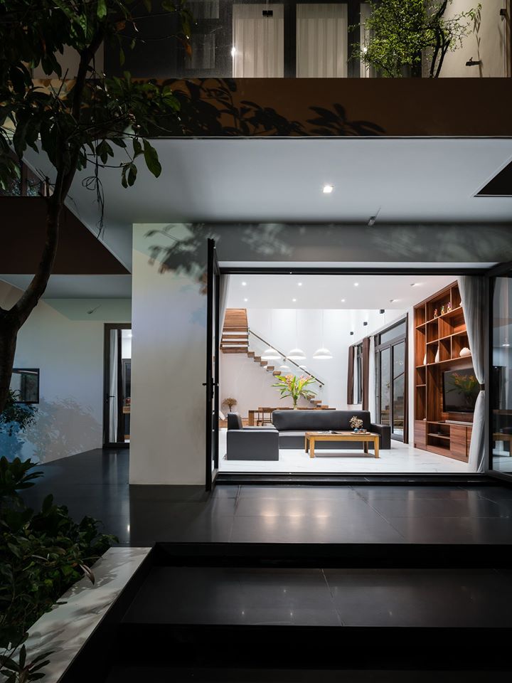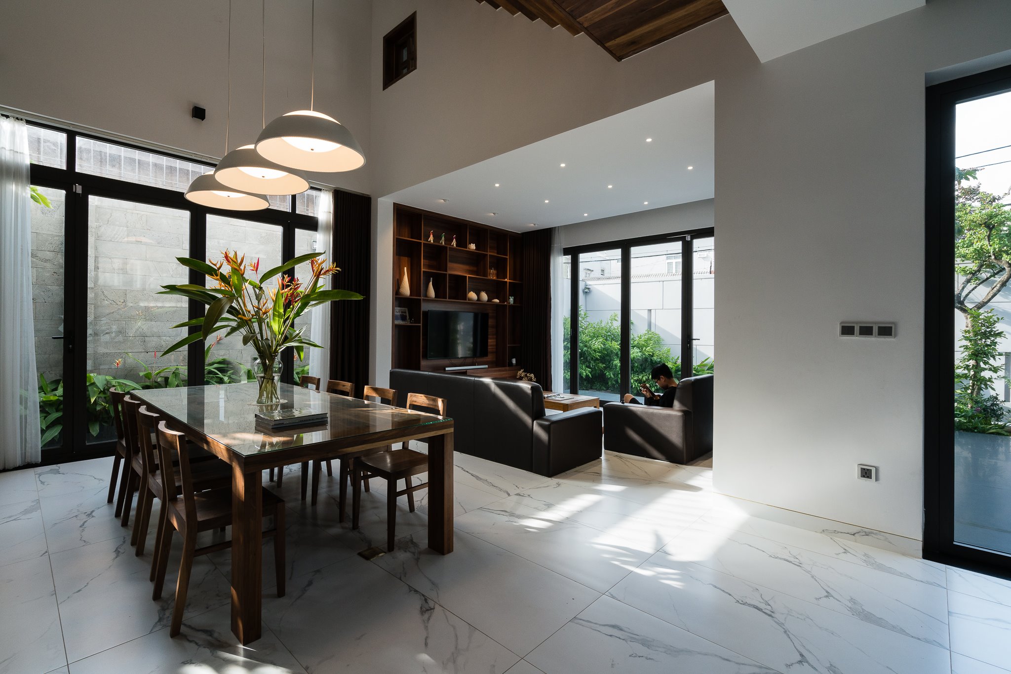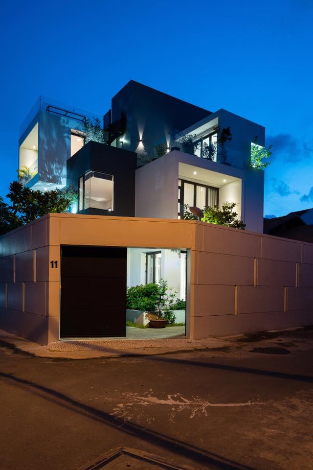 Trông như những khối hộp đồ chơi xếp chồng với nhiều ô cửa sổ, cây xanh. Hồ Chương House được lựa chọn giải pháp là những bức tường trắng có khe dọc và kẻ ron tường giúp thông gió và tạo cảm giác nhẹ nhàng, thanh thoát nên phía trong luôn thoáng mát dù bên ngoài kín cổng cao tường.