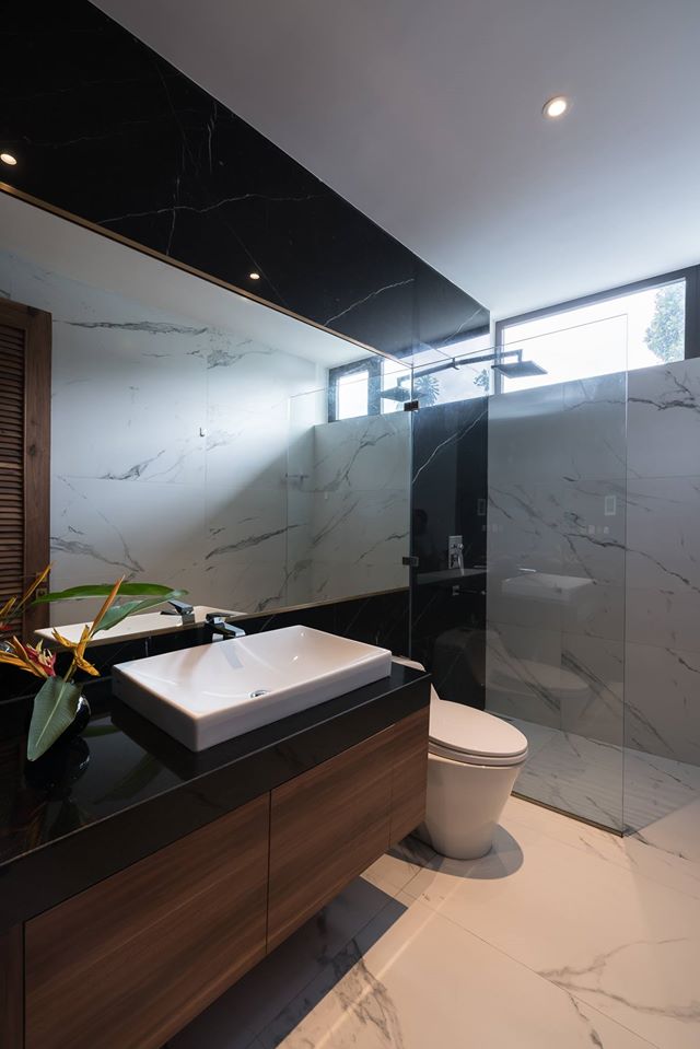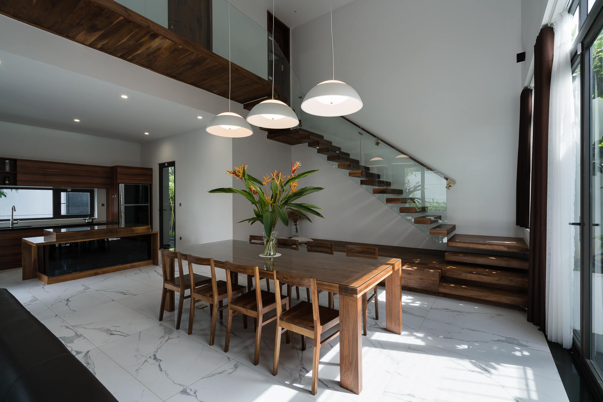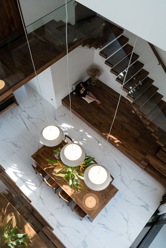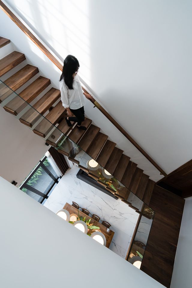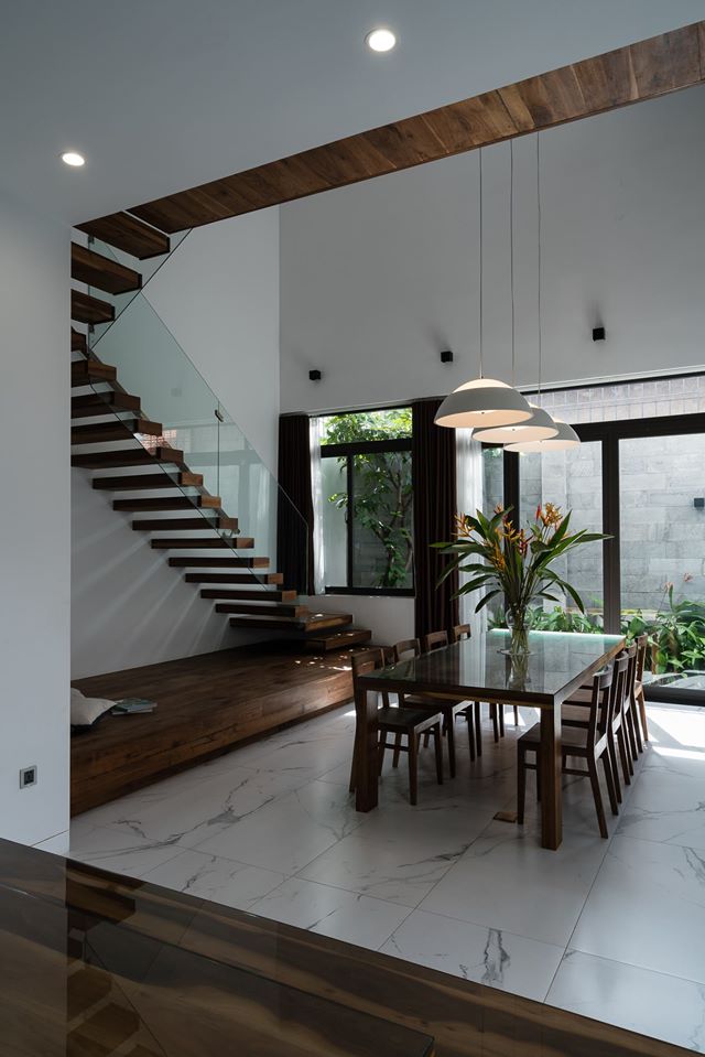 Trông như những khối hộp đồ chơi xếp chồng với nhiều ô cửa sổ, cây xanh. Hồ Chương House được lựa chọn giải pháp là những bức tường trắng có khe dọc và kẻ ron tường giúp thông gió và tạo cảm giác nhẹ nhàng, thanh thoát nên phía trong luôn thoáng mát dù bên ngoài kín cổng cao tường.