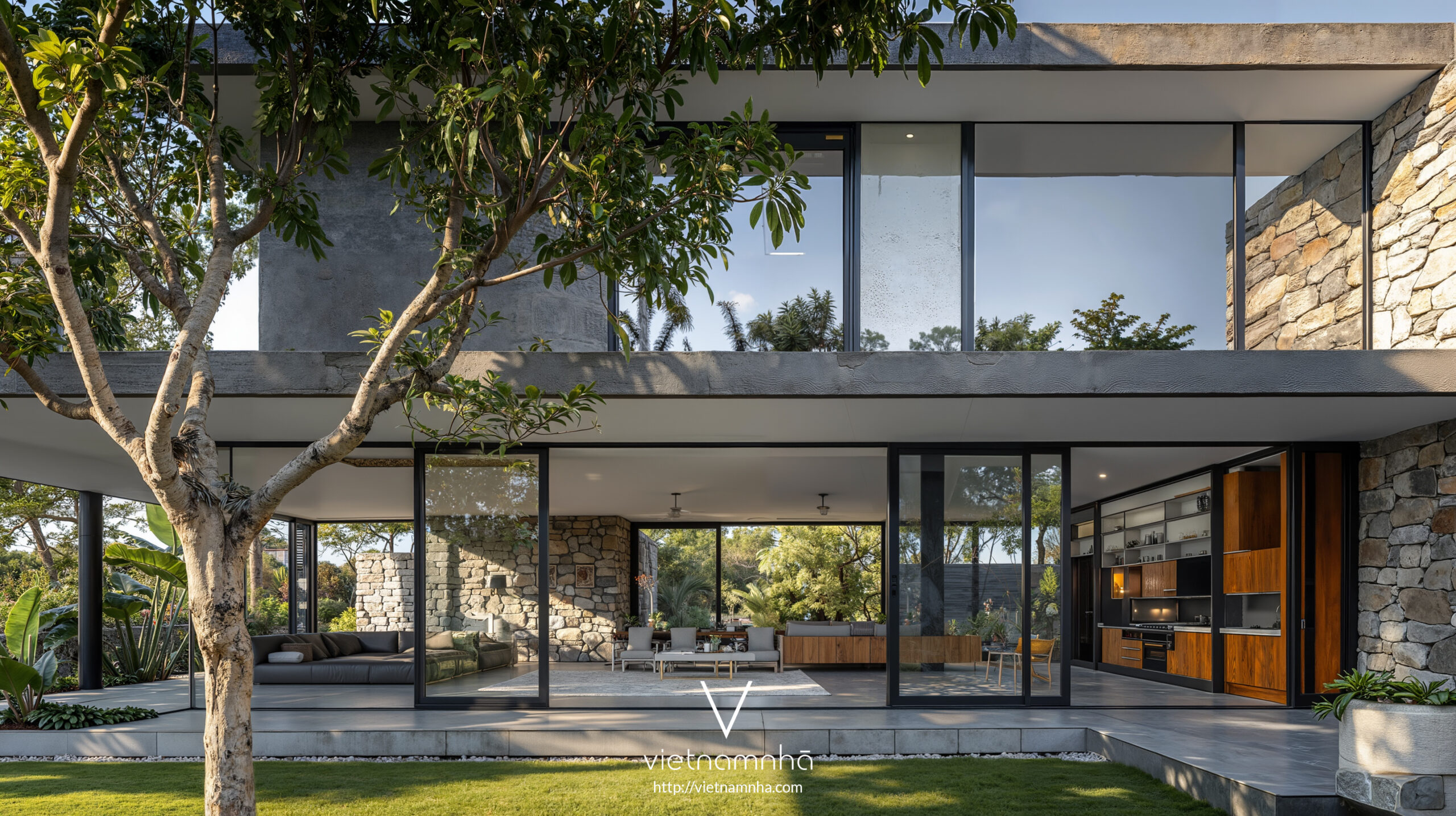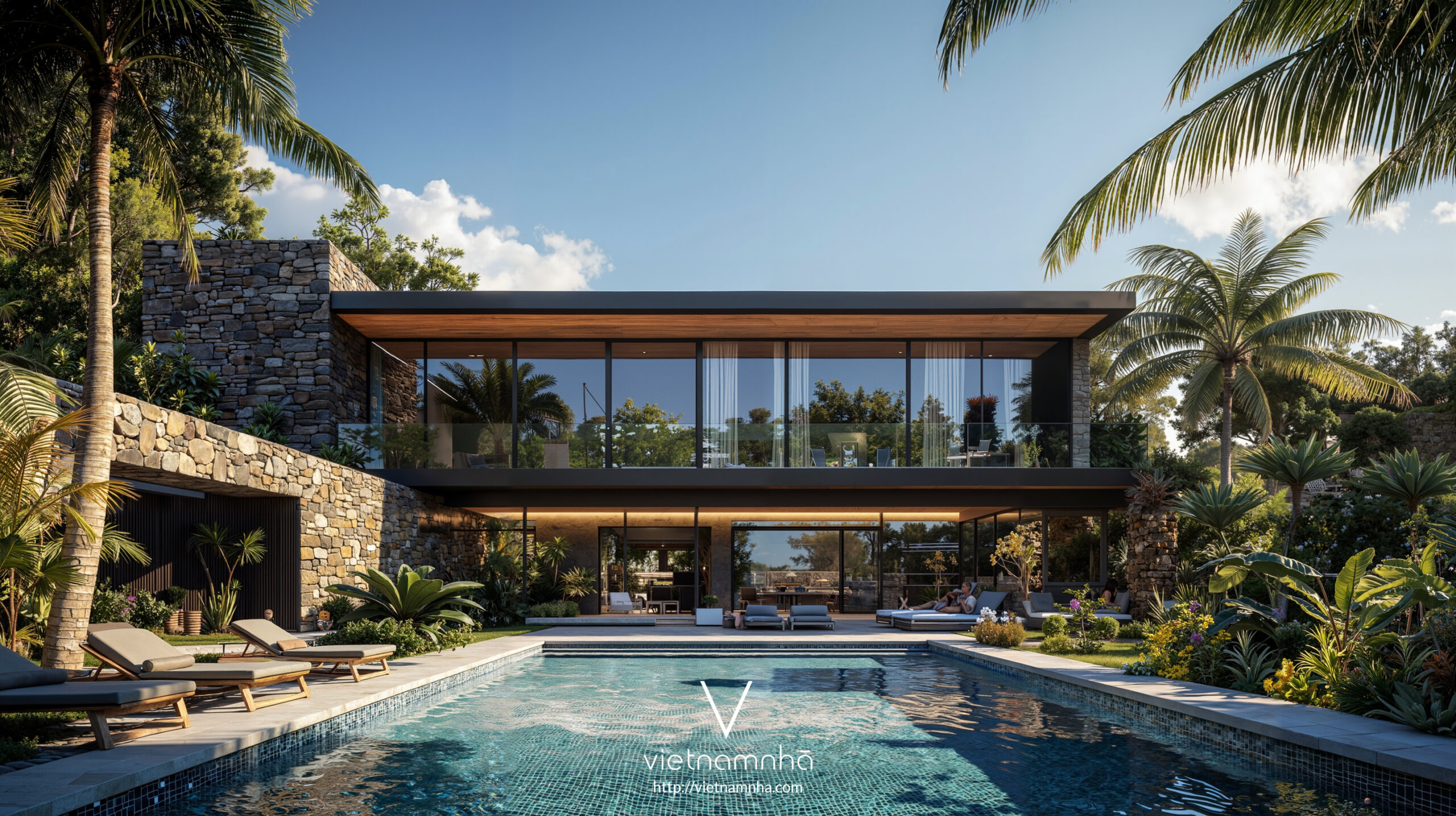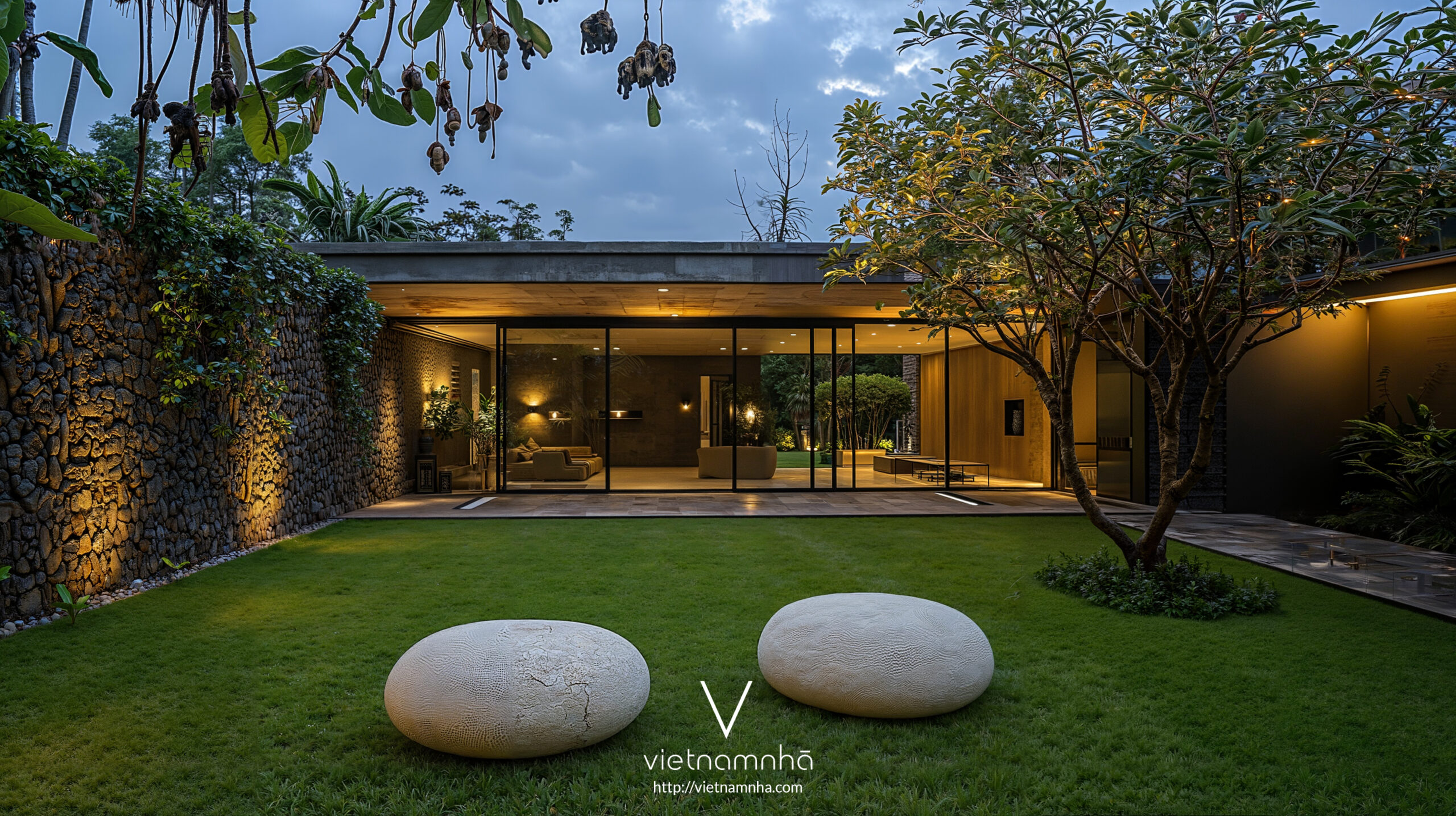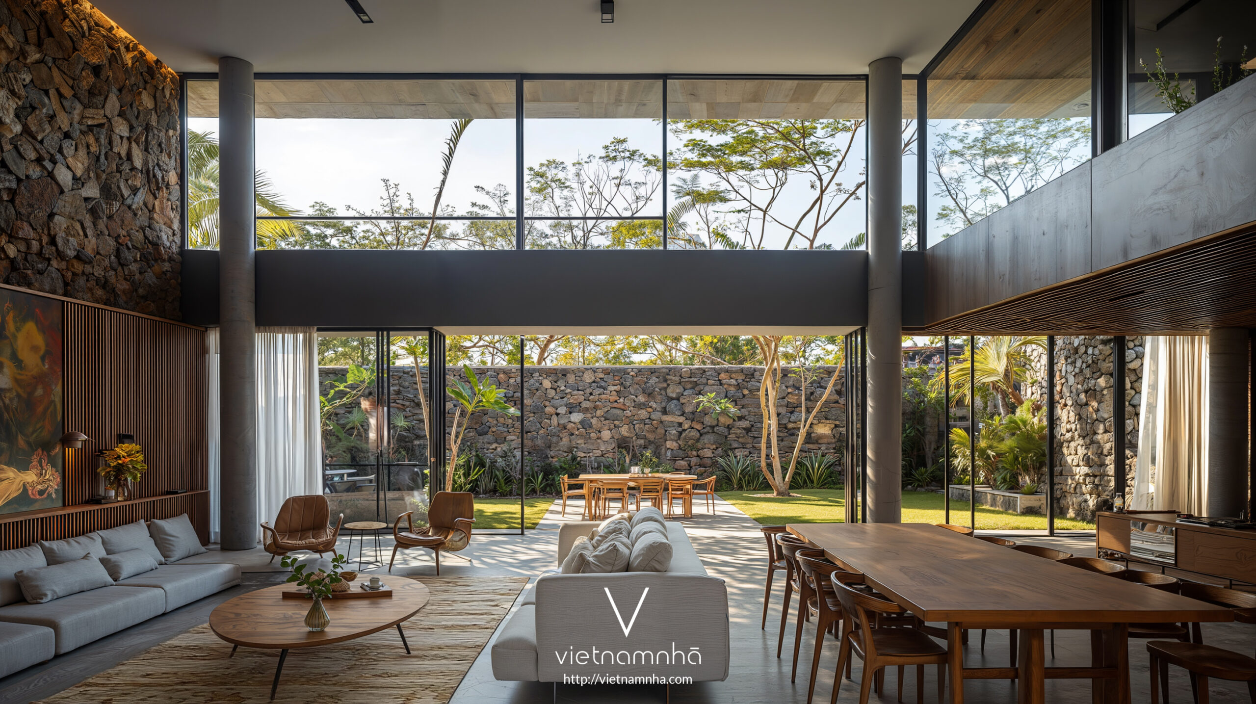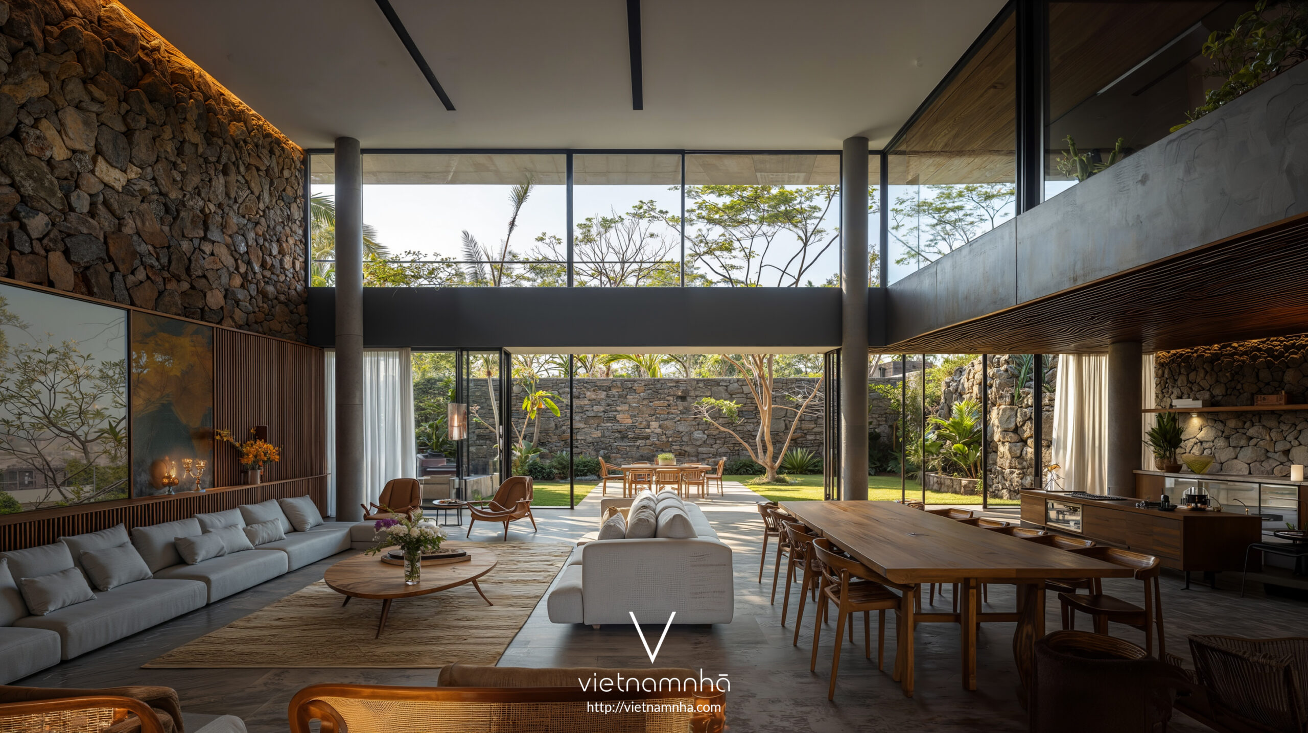 Sau đó, việc sử dụng đá cũng xuất hiện ở các phần khác nhau của tòa nhà. Bên cạnh đá sông, suối ở Lâm Đồng. Chúng tôi đã lấy những viên đá này từ khắp Việt Nam. Sự kết hợp giữa các vật liệu tự nhiên của Việt Nam với các vật liệu xây dựng hiện đại hơn càng củng cố thêm ý tưởng của biệt thự LD Hill có phong cách nhiệt đới đương đại.