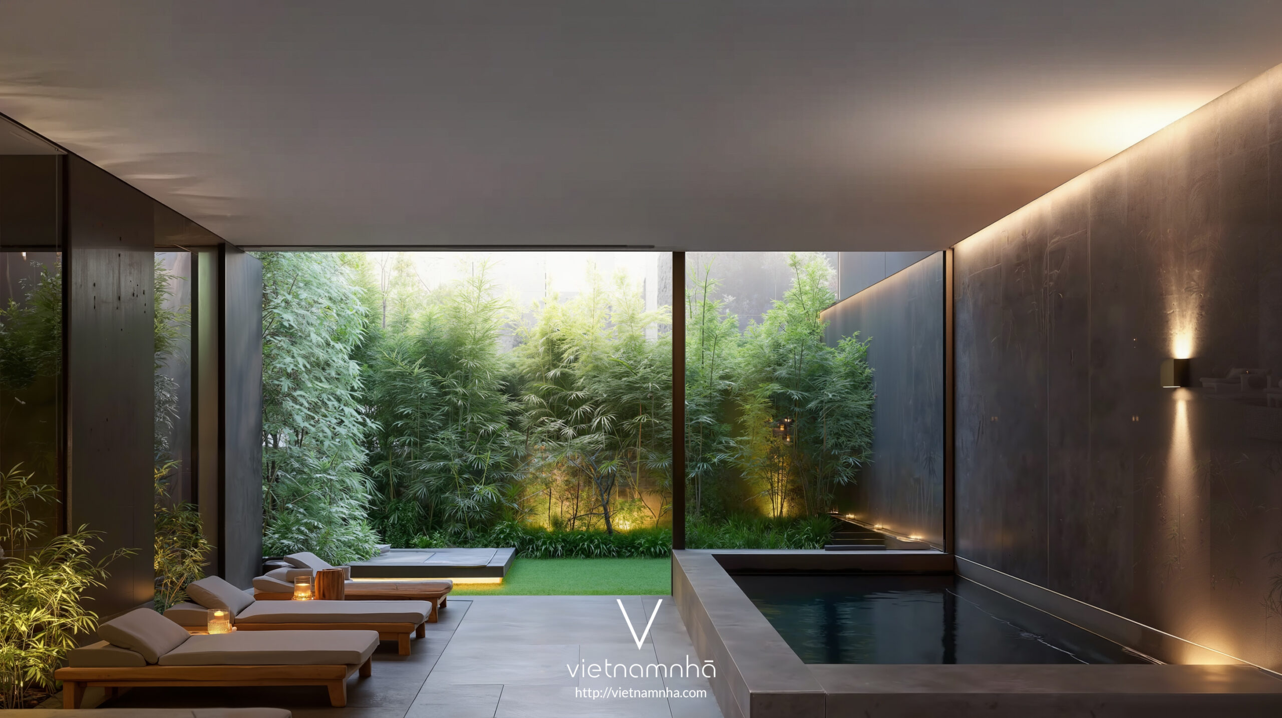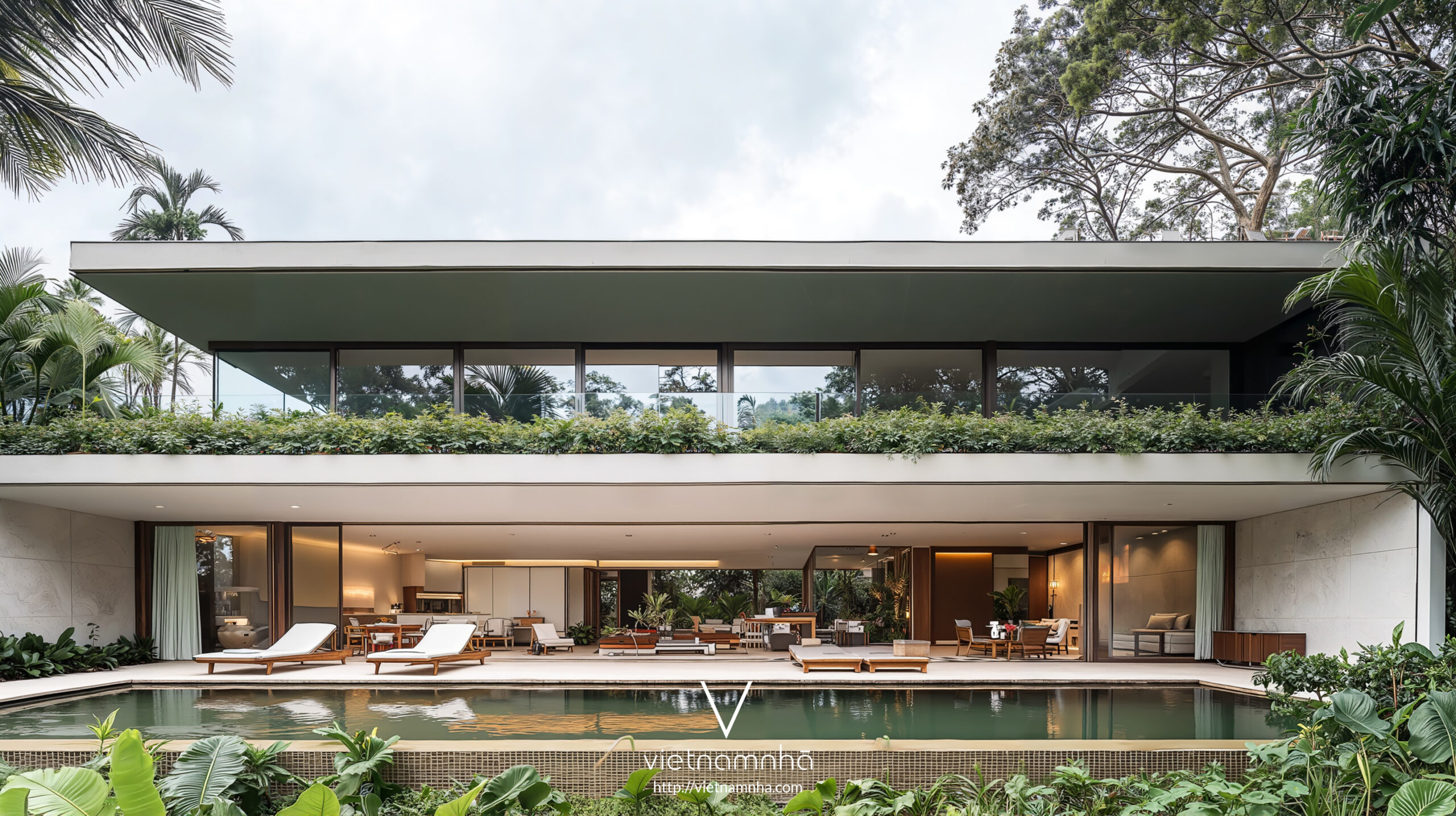 Hầu hết tường được thay bằng kính lớn, tạo sự hòa quyện nội – ngoại, không gian luôn nhận ánh sáng tự nhiên và cảnh quan xanh
