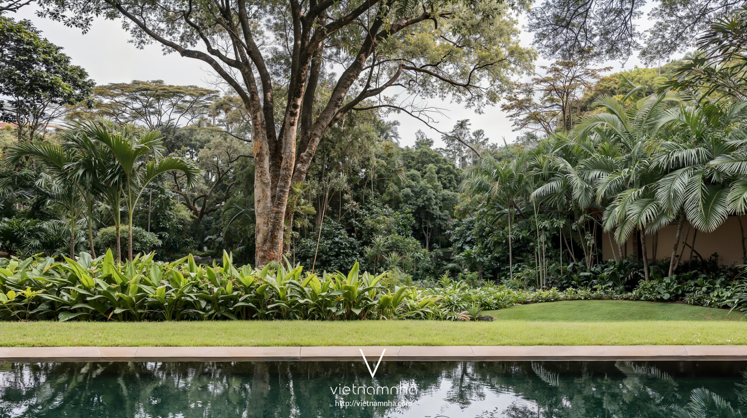 Nhà chính được đặt lùi sâu về phía sau, để khai thác tầm nhìn tối đa lên tán cây từ mọi không gian trong nhà. Đồng thời tạo ra khoảng sân vườn dày và garage nằm phía dưới tầng trệt .