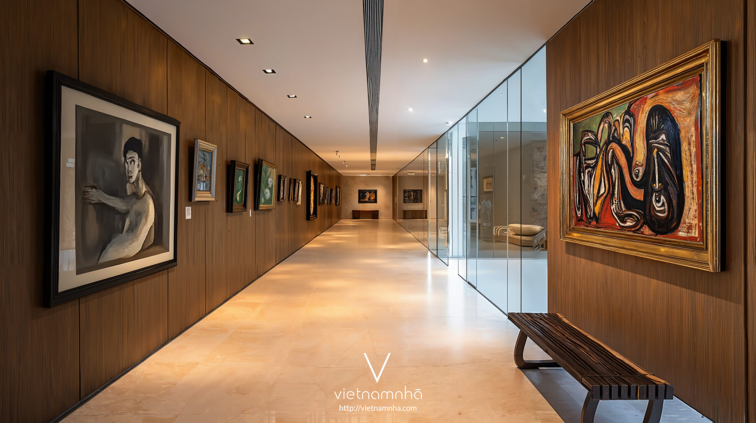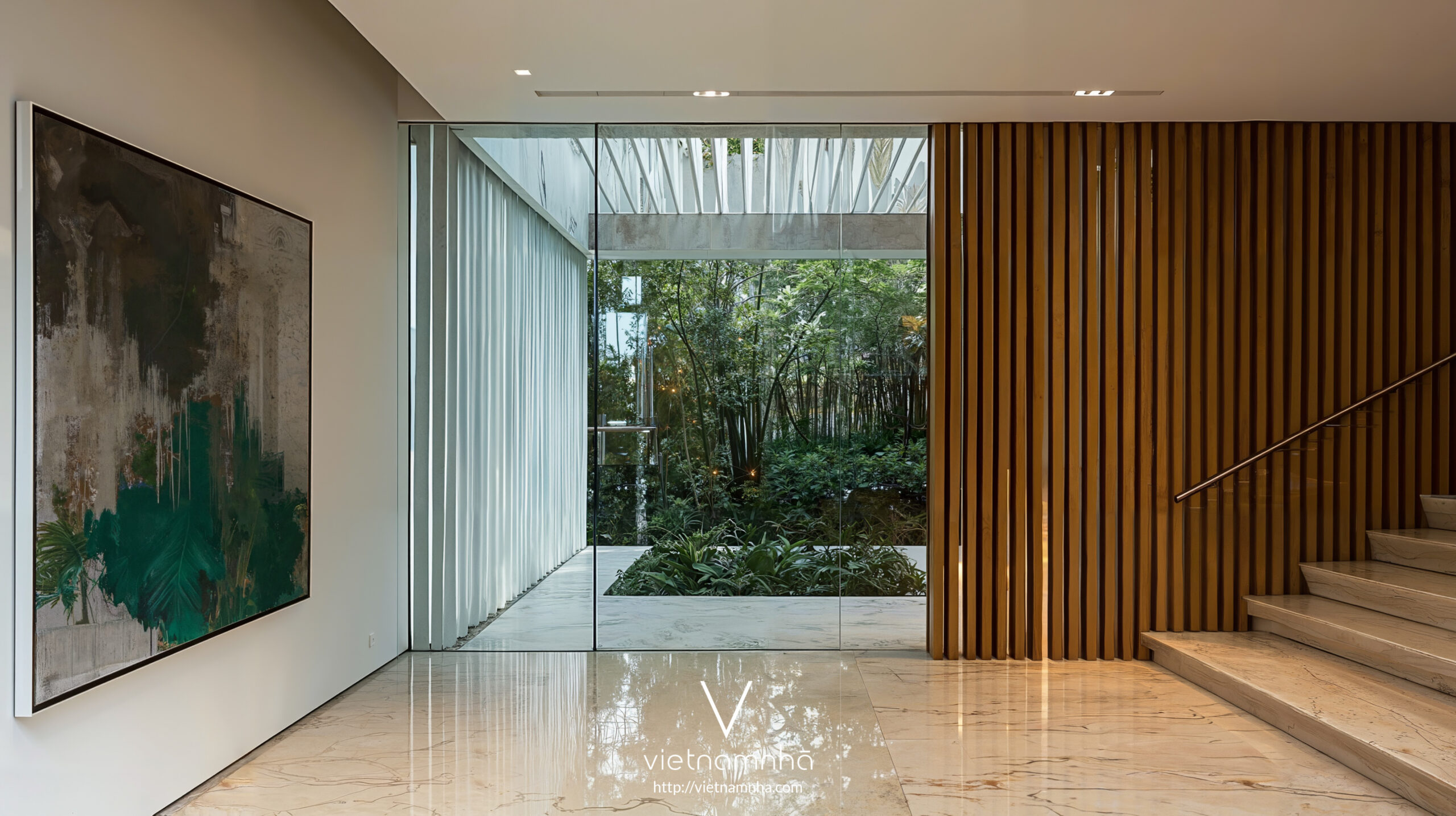 Sảnh vào bố trí cloister có giếng trời lớn, hòa sáng gián tiếp và tạo lối dẫn thị giác vào trong