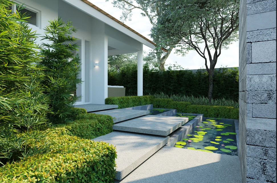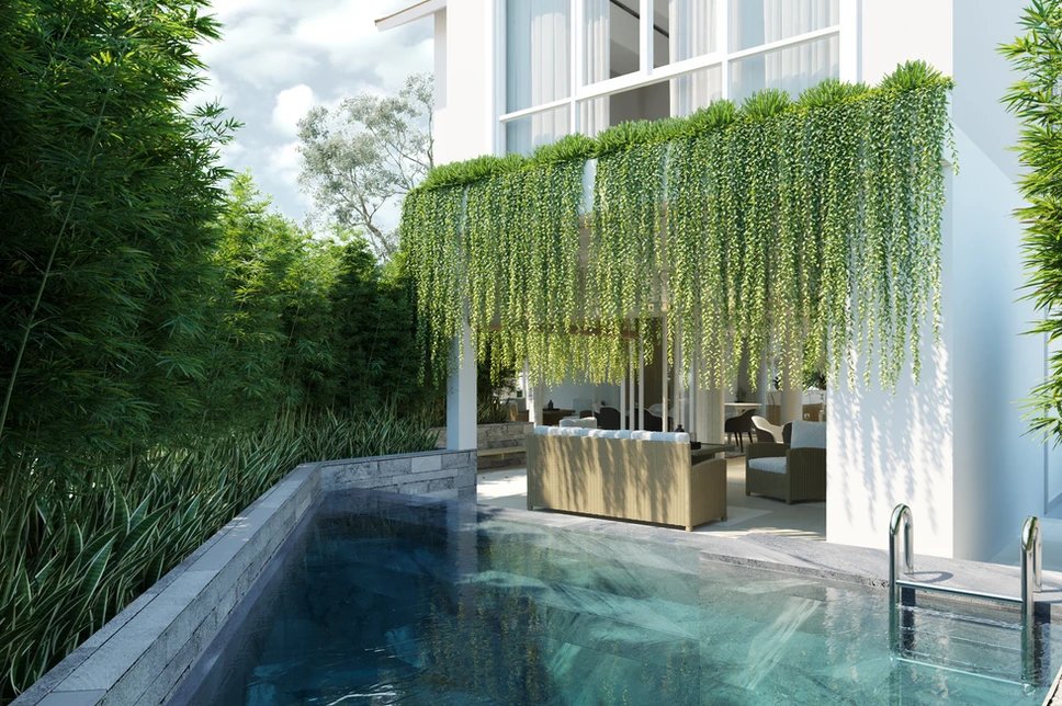 Khuôn viên xung quanh được thiết kế theo phong cách sân vườn, kết hợp hòa quyện với cây cảnh, hồ bơi và bố trí khu vực hồ sen tạo không khí thoáng đãng và thoải mái. Với sự liền lạc từ thiết kế kiến trúc nội thất, tối ưu tầm nhìn, đem đến cảm giác hài hòa với thiên nhiên xanh ngát bên ngoài đã làm tăng thêm sức hút cho villa.