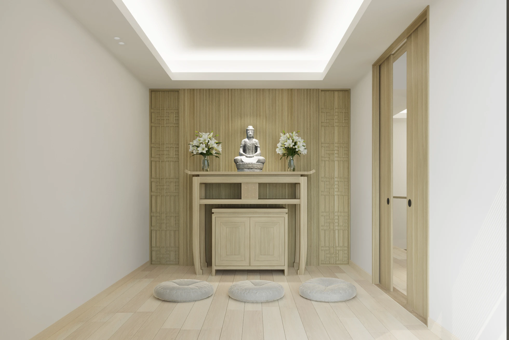 Phòng thờ thiết kế tối giản nhưng không kém phần sang trọng và thiêng liêng, NTK tận dụng tối đa không gian trống để phòng thờ không có cảm giác bí bách chật hẹp. Tông màu nền nhã của màu gỗ sáng tạo không khí ấm áp và thiêng liêng cho phòng thờ của gia đình.